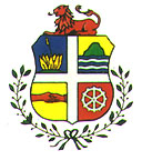 Der Schild zeigt die Symbole des Volkes: links oben die goldene Aloeplanze